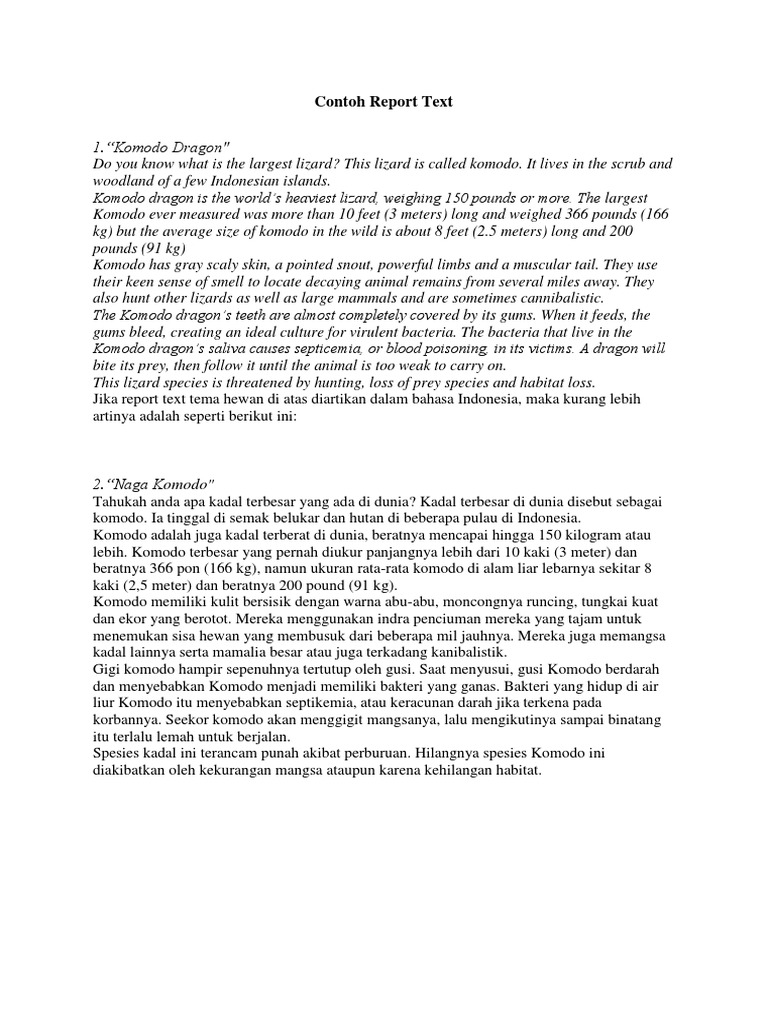 It was an interesting film about a plane which crashed on a small empty island in the pacific ocean. Semua hal yang dideskripsikan dalam report text merupakan deskripsi yang bersifat general dan mewakili keseluruhan dari jenis objek tersebut. Kindly be contoh soal essay report text pendek informed that these prices can be paid in two installments. Mungkin inilah salah satu alasan mengapa ada banyak sekali yang ingin … 10 contoh narative text pendek bahasa inggris dan artinya terbaru