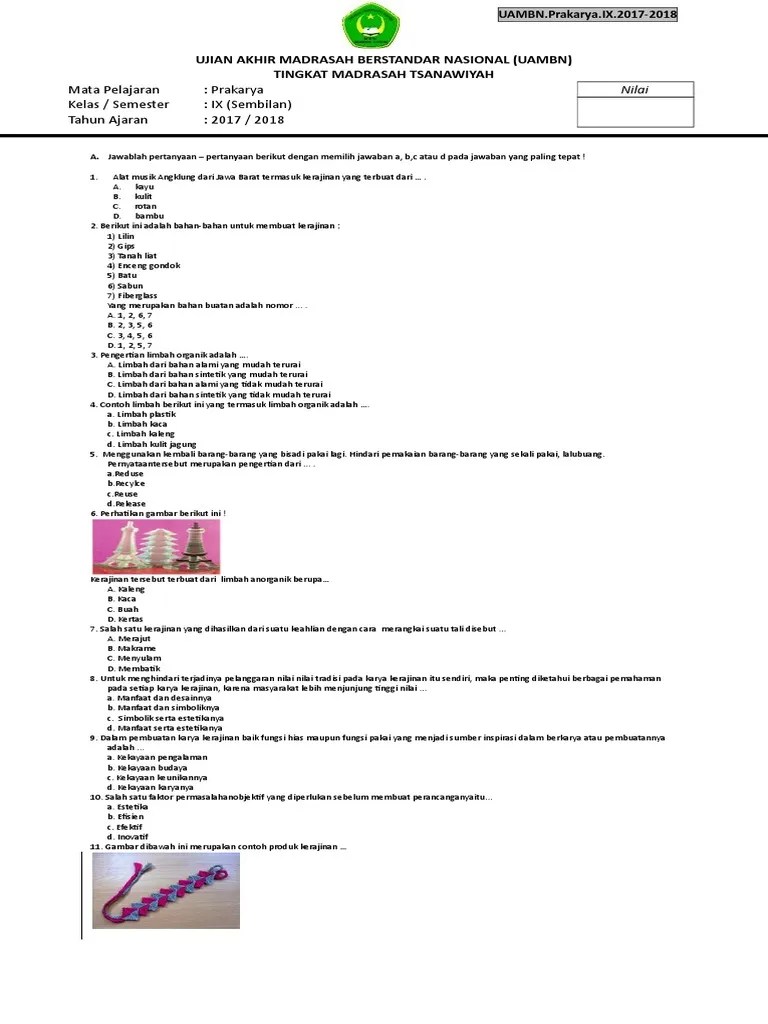 Soal dan kunci jawaban ujian sekolah prakarya smp kurikulum 2013 .
