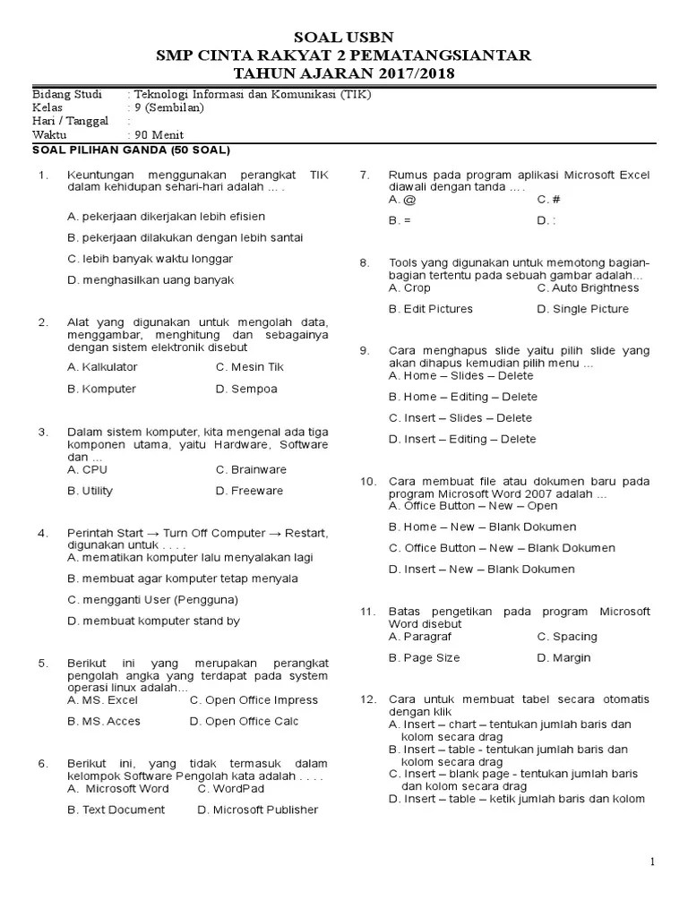 Pada kesempatan yang baik ini kakak ingin berbagi beberapa soal latihan uas untuk mata pelajaran tik yang dikhususkan kelas 9 . Download soal dan kunci jawaban bahasa indonesia usbn 2018 pdf hari demi hari. Soal usbn tik smp 2017 2018 kurikulum 2013 ktsp dan kunci . Soal us bentuk uraian diperiksa secara manual: Adik adik dimana saja berada.